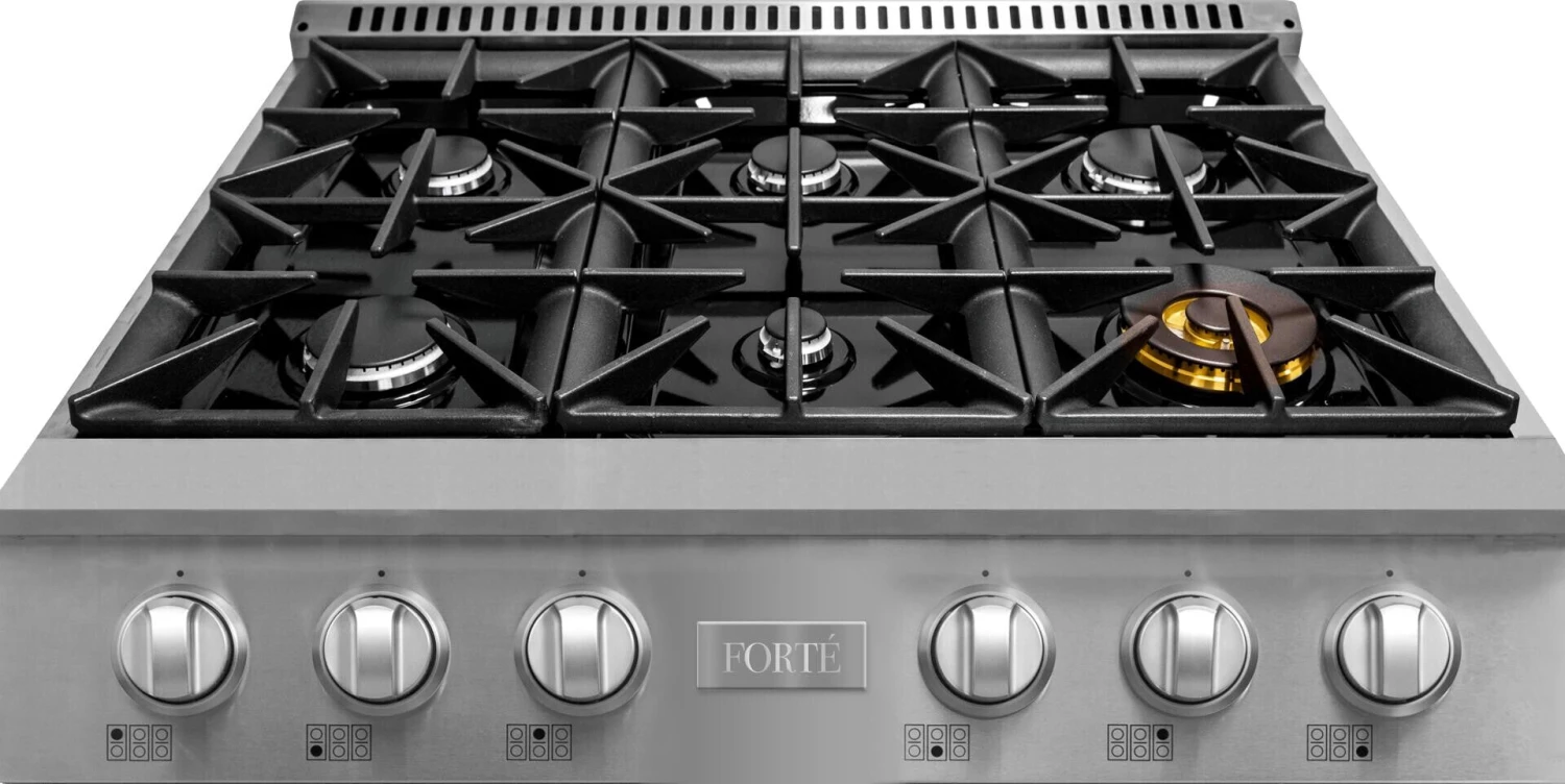 The FGRT366 36″ Gas Rangetop by Forte comes with 6 Sealed Italian Burners and also features Edge-to-Edge Grates and Heavy Duty Stainless Steel Knobs.