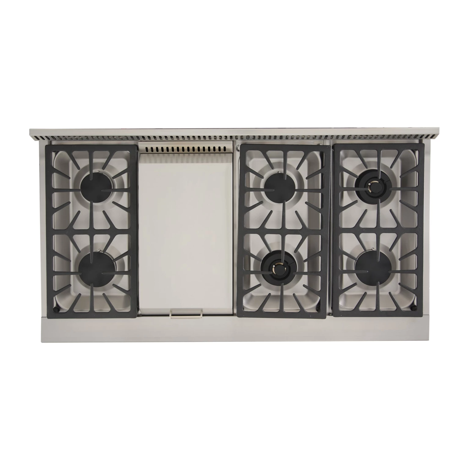 - 2 x 18,000 BTU burners / 2 x 15,000 BTU burners with simmer / 2 x 12,000 BTU burners / 1 x 18,500 BTU Griddle