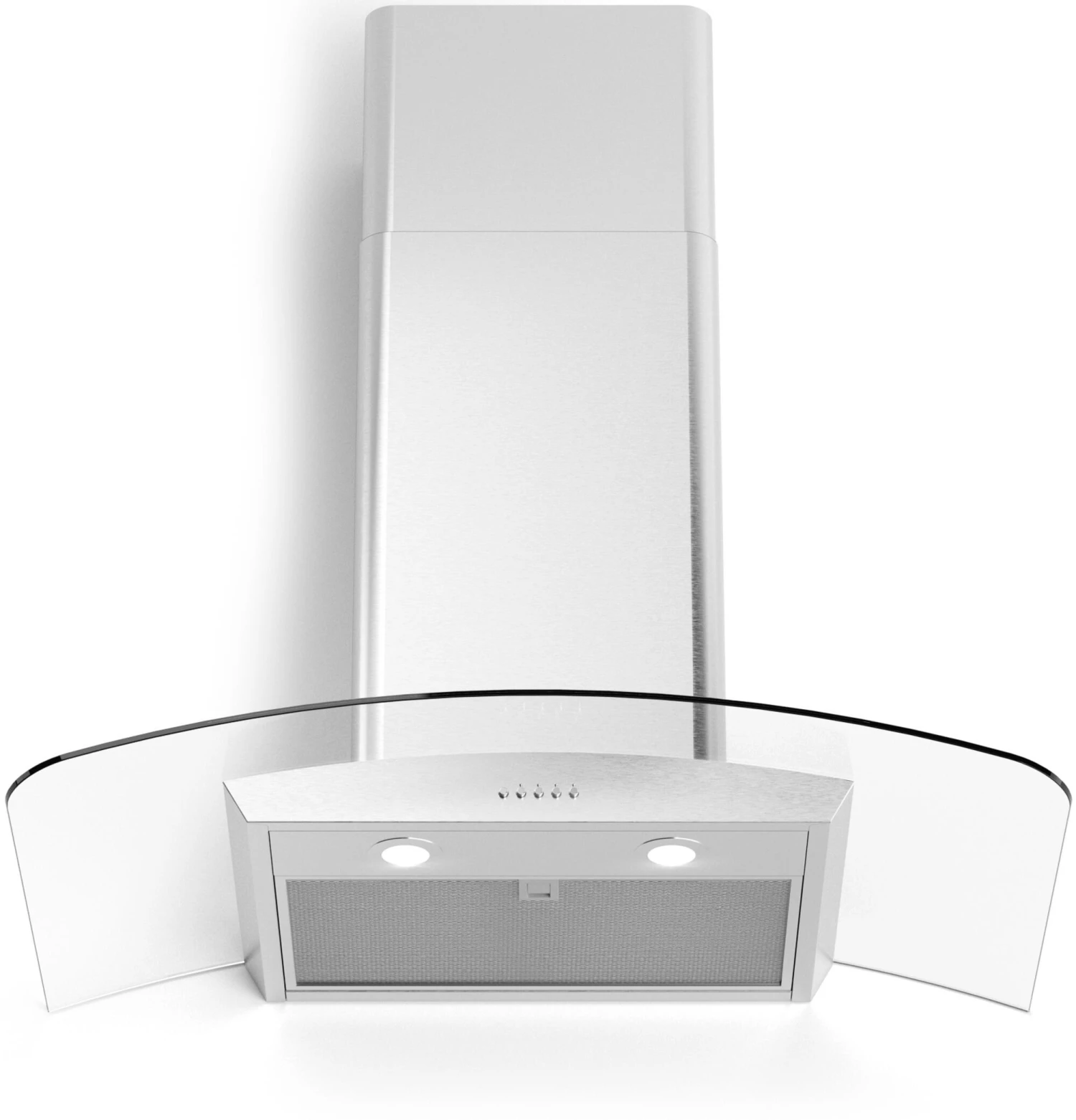 This Italian Cortivo wall mount range hood by Forte offers 600 CFM to handle odors and fumes from your kitchen and features a glass canopy for a modern style aesthetic.