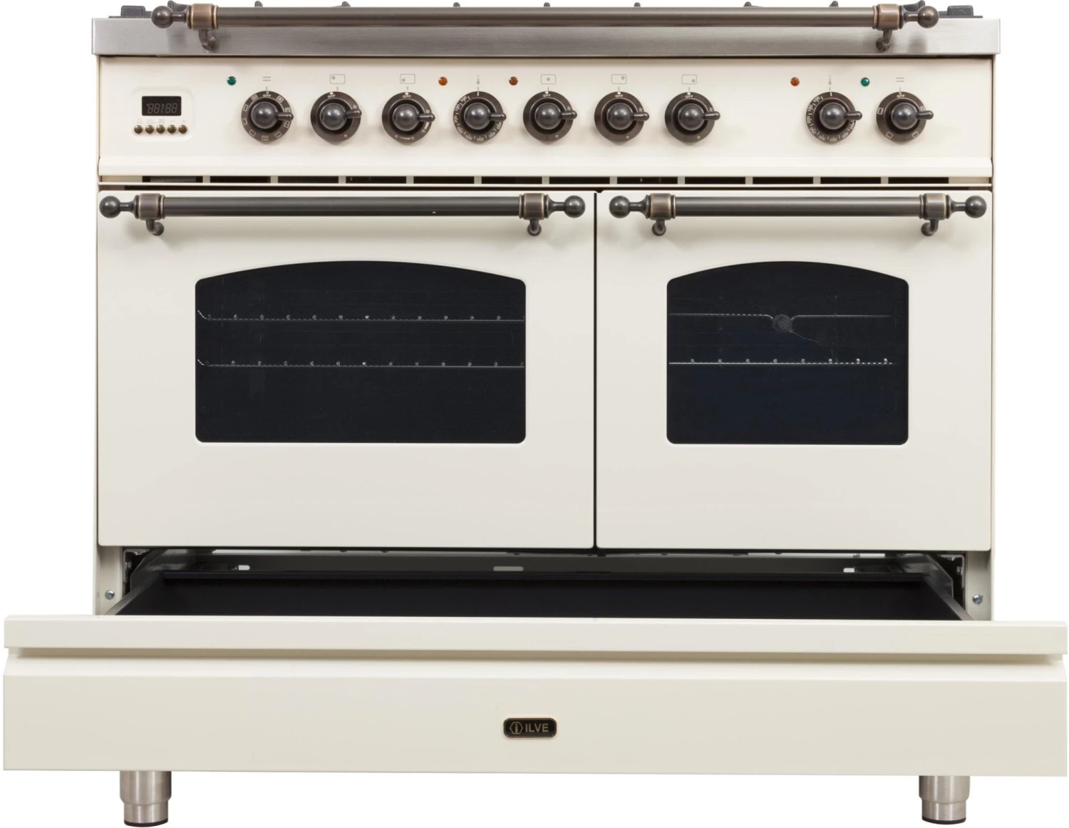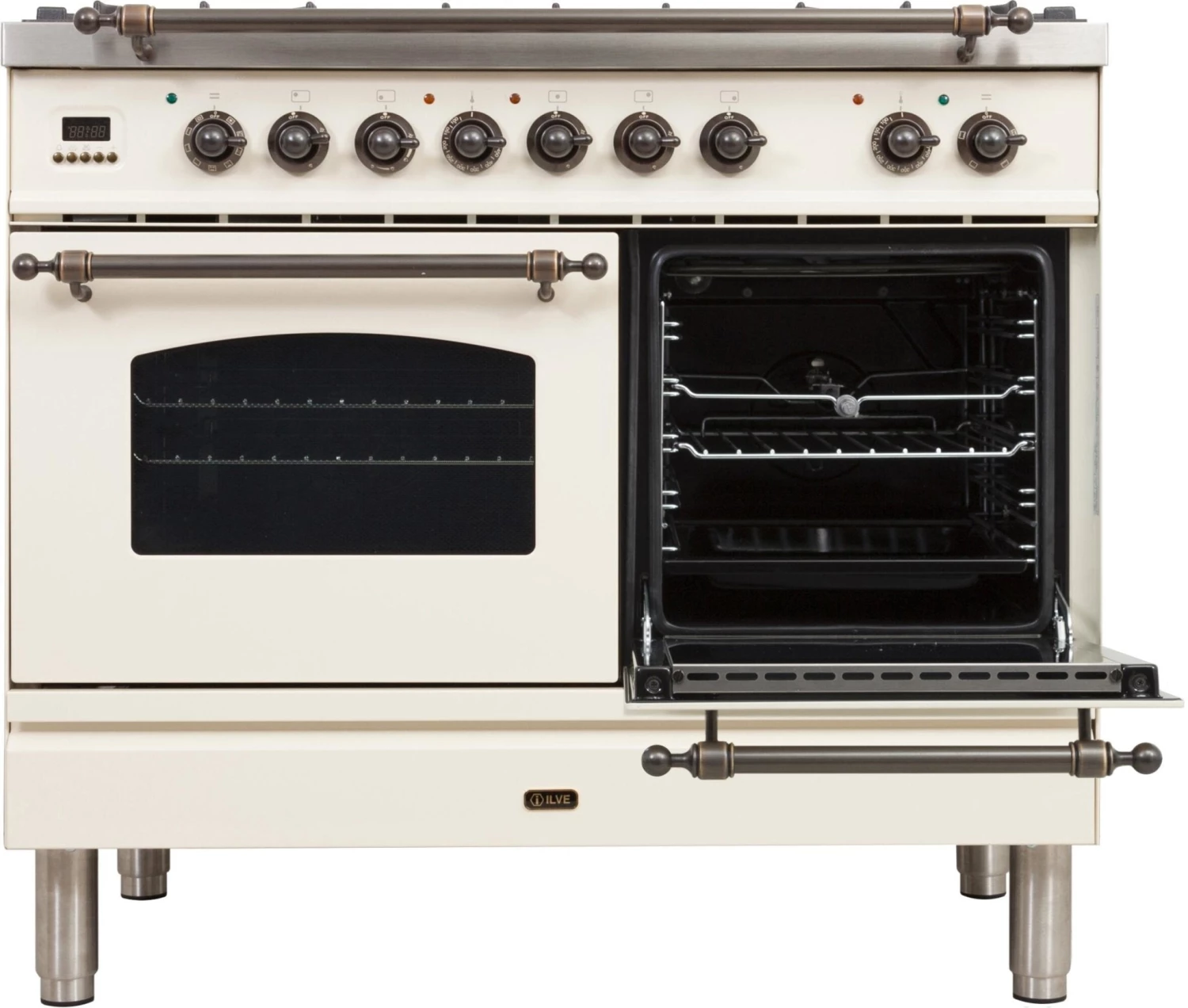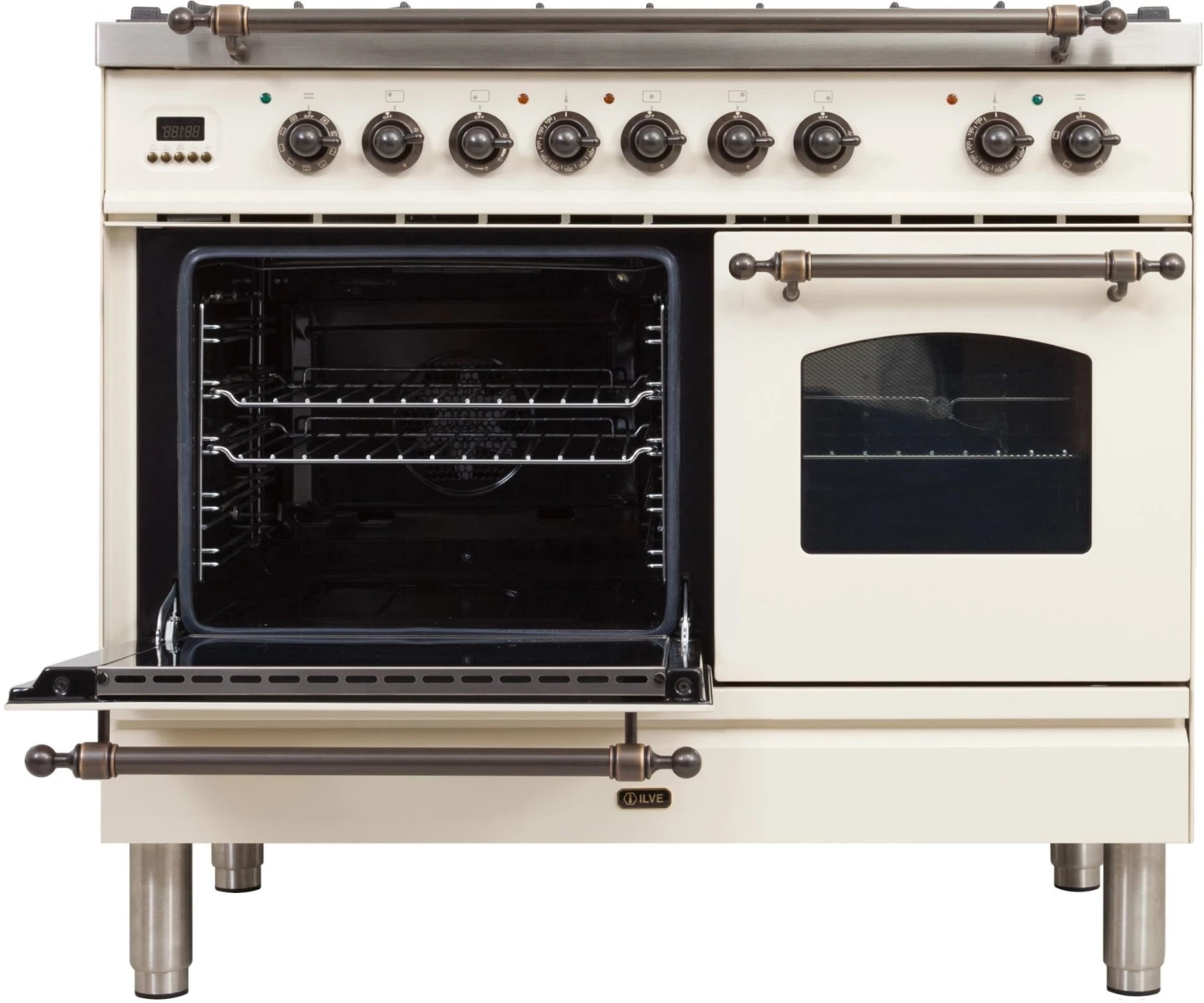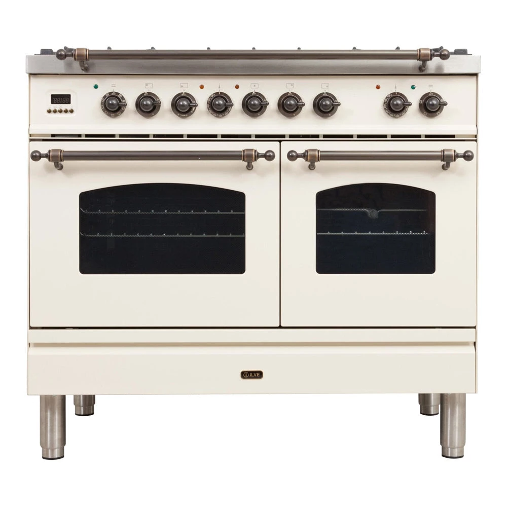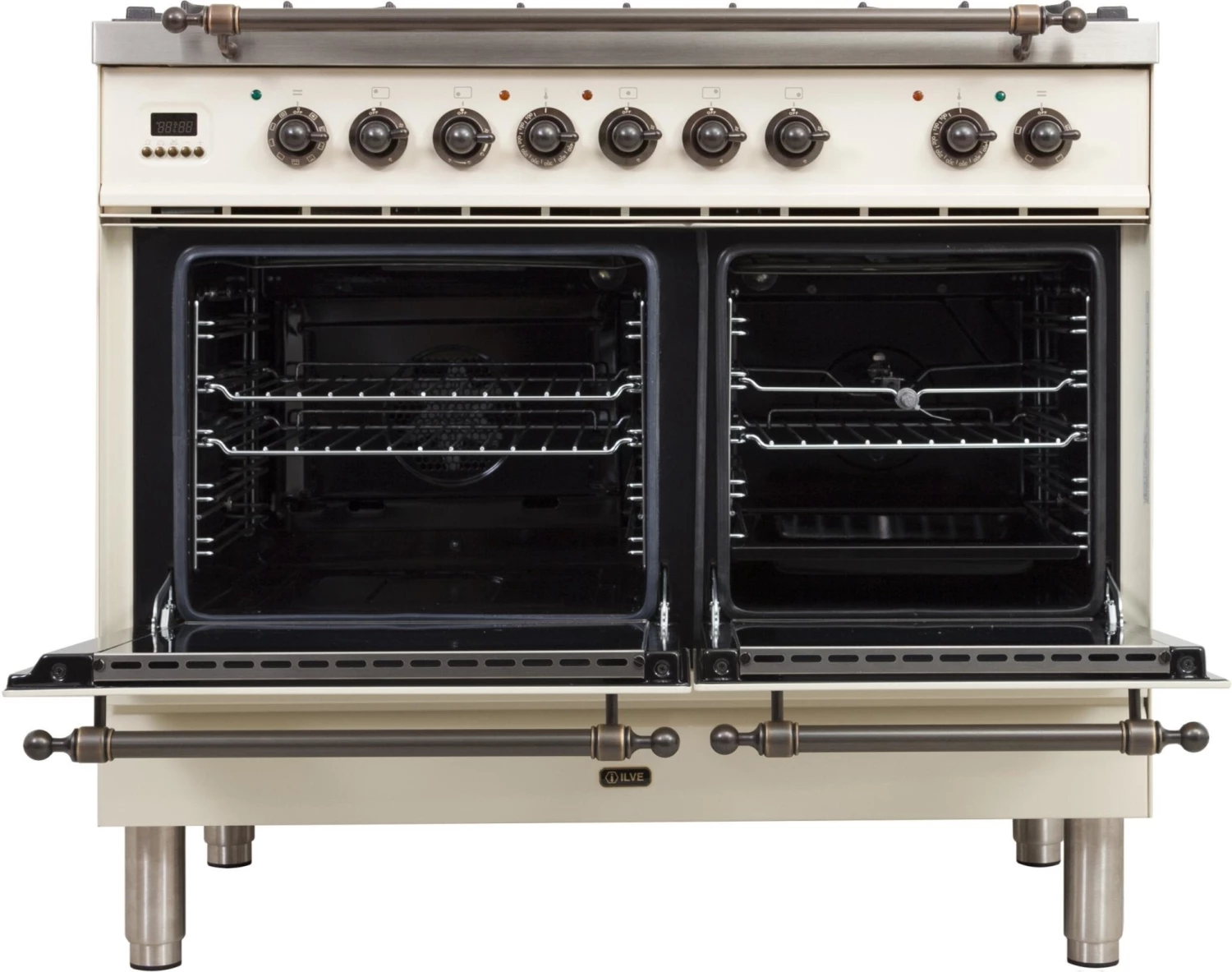 Shop By Brand ILVE 40″ 4.88 Cu. Ft. Nostalgie Series Freestanding Dual Fuel Range In Antique White And Bronze Accents