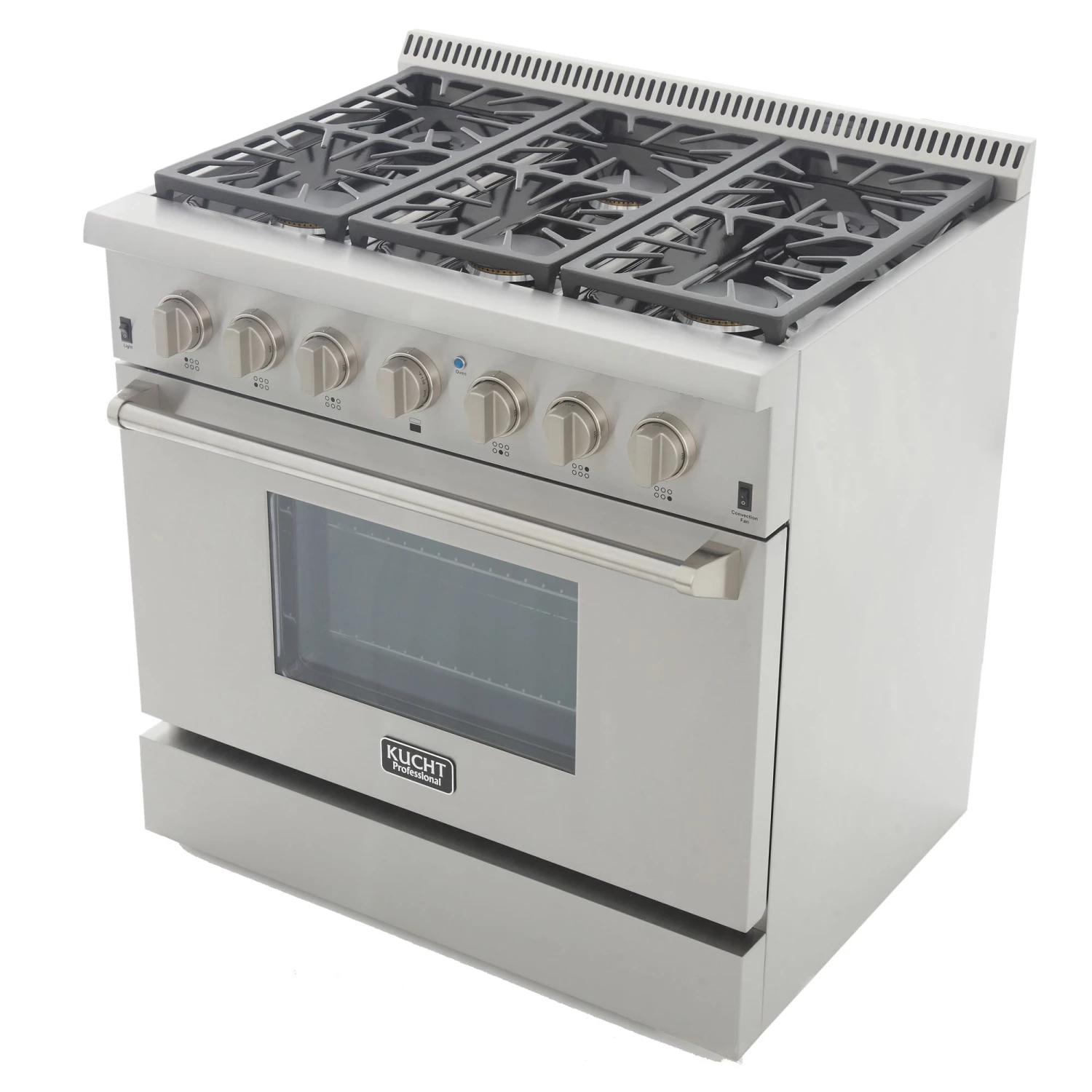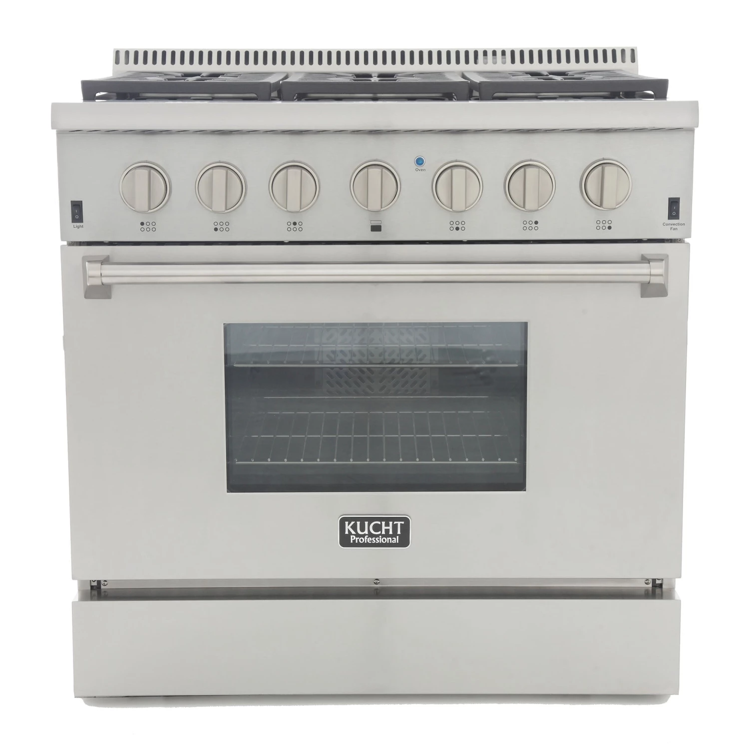 Model KRG3618U – 36” Pro Class Kitchen Range Larger Range for Larger Kitchens! Have a larger sized home kitchen? Then our 36” wide Kucht KRG3618U may be just perfect for you! Replacing our KRG3603U model, this professional grade range boasts 6 individual burners – and now comes with a high intensity 18,000 BTU burner. Of course, you’ll also find our heavy-duty, blue porcelain 5.2 Cubic Foot 22,000 BTU Convection Oven, along with a 16,500 BTU infra-red broiler. As with all Kucht ranges, it’s the attention to detail coupled with old-world craftsmanship that will turn your average home cooking area into a restaurant quality kitchen.