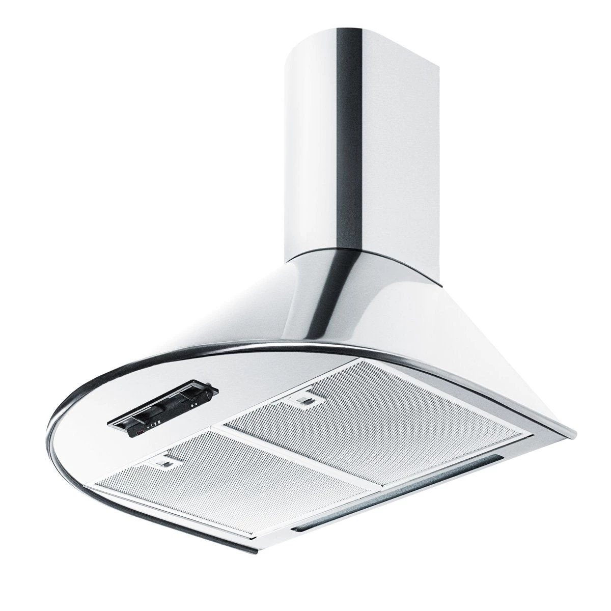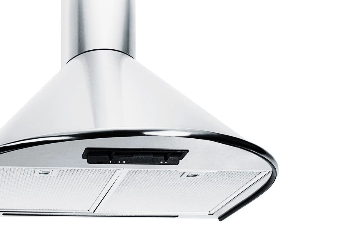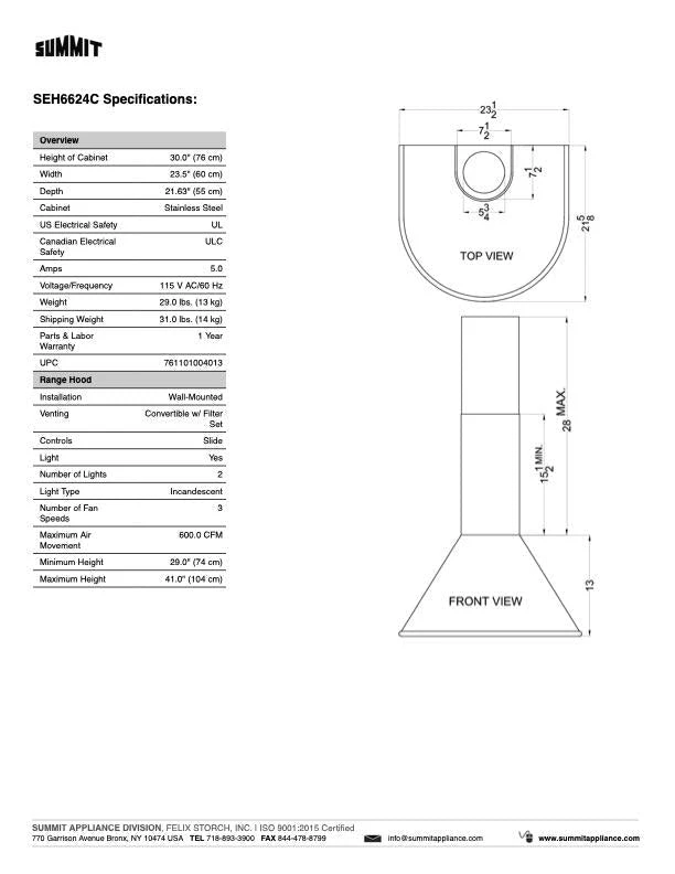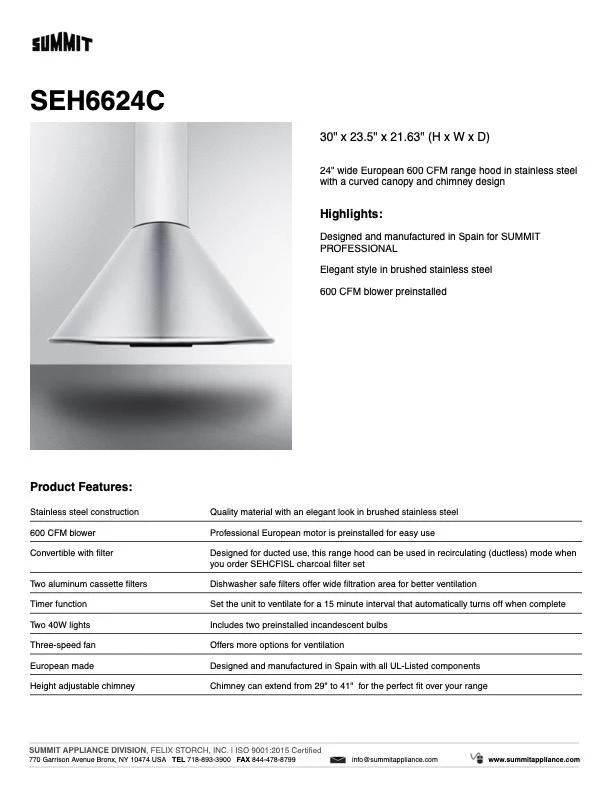 SUMMIT PROFESSIONAL introduces a new line of European wall-mounted range hoods designed for outstanding performance and elegant style. SUMMIT SEH6624C is a 24″ wide range hood with a 600 CFM blower and unique curved canopy design. Constructed entirely from stainless steel, it features an adjustable chimney and two aluminum cassette filters with a wide filtration area. The 3-speed fan and 15 minute timer are operated with a slider control panel. Two 40W incandescent light bulbs are pre-installed, offering an elegant illumination over your range or cooktop. The SEH6624C is designed for ducted use, but may be converted to a ductless (recirculating) range hood when you order an optional charcoal filter set (SEHCFISL). This model is manufactured in Spain and ships in one box.