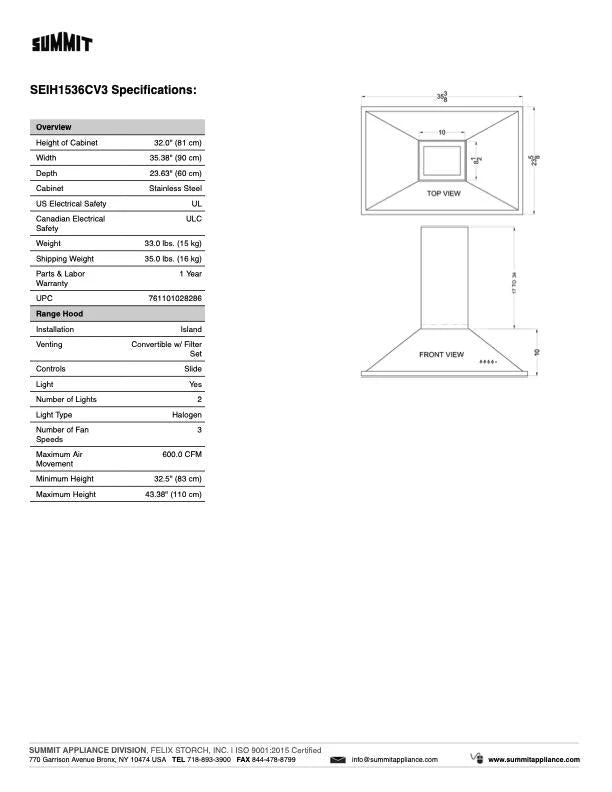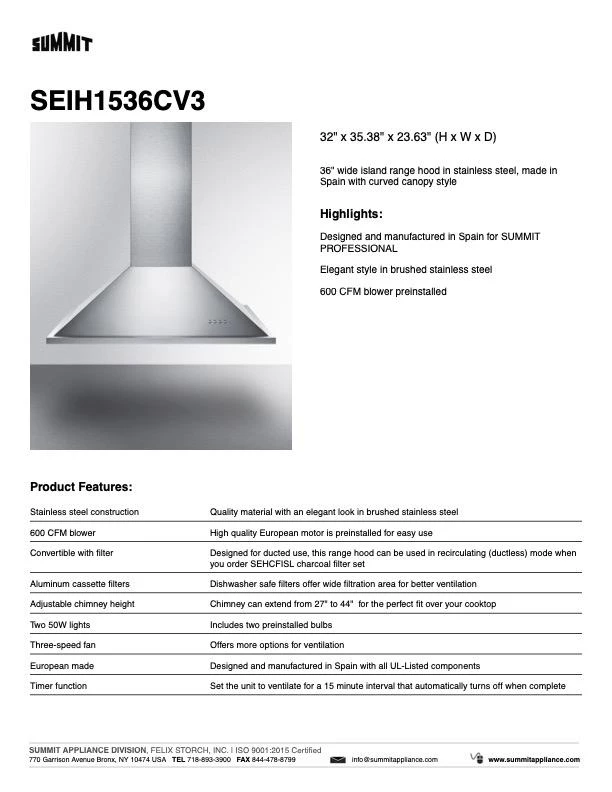 SUMMIT’s island range hoods are made in Spain with quality construction and stunning style. The SEIH1536CV3 is a 36″ wide range hood with a 600 CFM blower. Constructed entirely from stainless steel, it features an adjustable chimney and aluminum cassette filters with a wide filtration area. The 3-speed fan and 15 minute timer are operated with intuitive digital controls. Two 50W halogen light bulbs are pre-installed, offering an elegant illumination for your cooktop or range. The SEIH1536CV3 is designed for ducted use, but may be converted to a ductless (recirculating) range hood when you order an optional charcoal filter set (SEHCFISL). This model is manufactured in Spain and ships in one box.