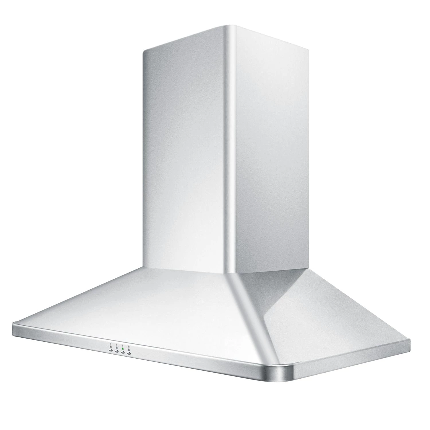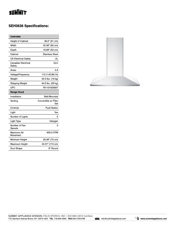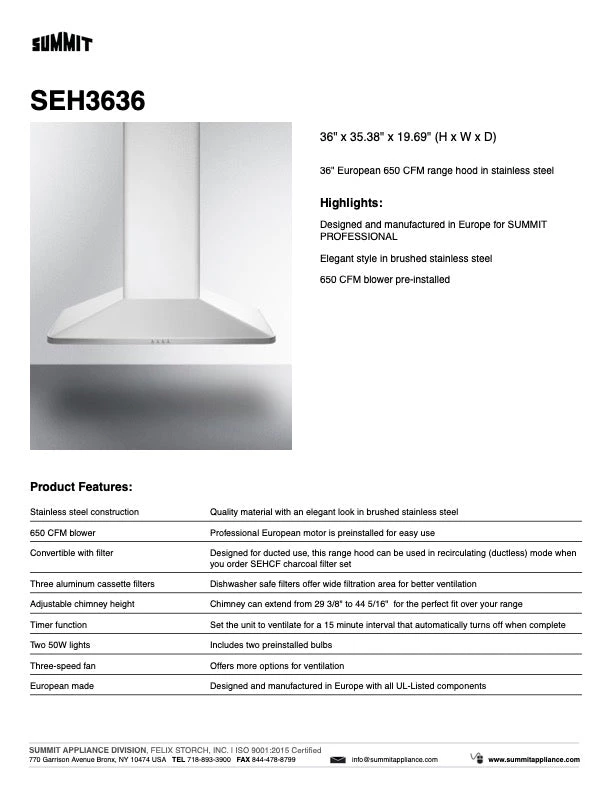 SUMMIT PROFESSIONAL introduces a new line of European wall-mounted range hoods designed for outstanding performance and elegant style. SUMMIT SEH3630 is a 30″ wide range hood with a 650 CFM blower. Constructed entirely from stainless steel, it features an adjustable chimney and two aluminum cassette filters with a wide filtration area. The 3-speed fan and 15 minute timer are operated with an intuitive touch controls. Two halogen light bulbs are pre-installed, offering an elegant illumination of your range. The SEH3630 is designed for ducted use, but may be converted to a ductless (recirculating) range hood when you order an optional charcoal filter set (SEHCF). This model is manufactured in Europe and ships in one box.