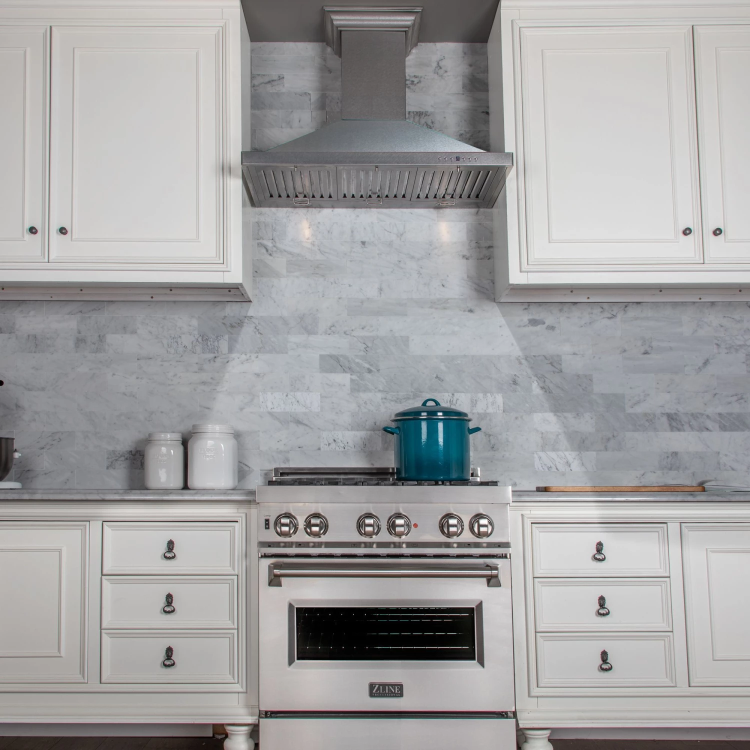 The ZLINE 8KBS is a professional wall mount DuraSnow stainless steel range hood with a modern design and built-to-last quality, making it a great addition to any kitchen. This hood’s high-performance, 4-speed motor will provide all the power you need to quietly and efficiently ventilate your stove while cooking. ZLINE’s exclusive DuraSnow stainless steel is a non-directional, smudge-resistant finish that contains rust, temperature, and corrosion-resistant properties to ensure a durable vent hood that will last for years to come. Enjoy modern features, including built-in LED lighting for an illuminated culinary experience and dishwasher-safe stainless steel baffle filters for easy clean-up. This wall mount range hood has a convertible vent, so you can have a luxury range hood whether you need a ducted or ductless option. Experience Attainable Luxury in the heart of your home, with a ZLINE range hood. ZLINE Kitchen and Bath stands by all products with its manufacturer parts warranty. The 8KBS ships next business day when in stock.