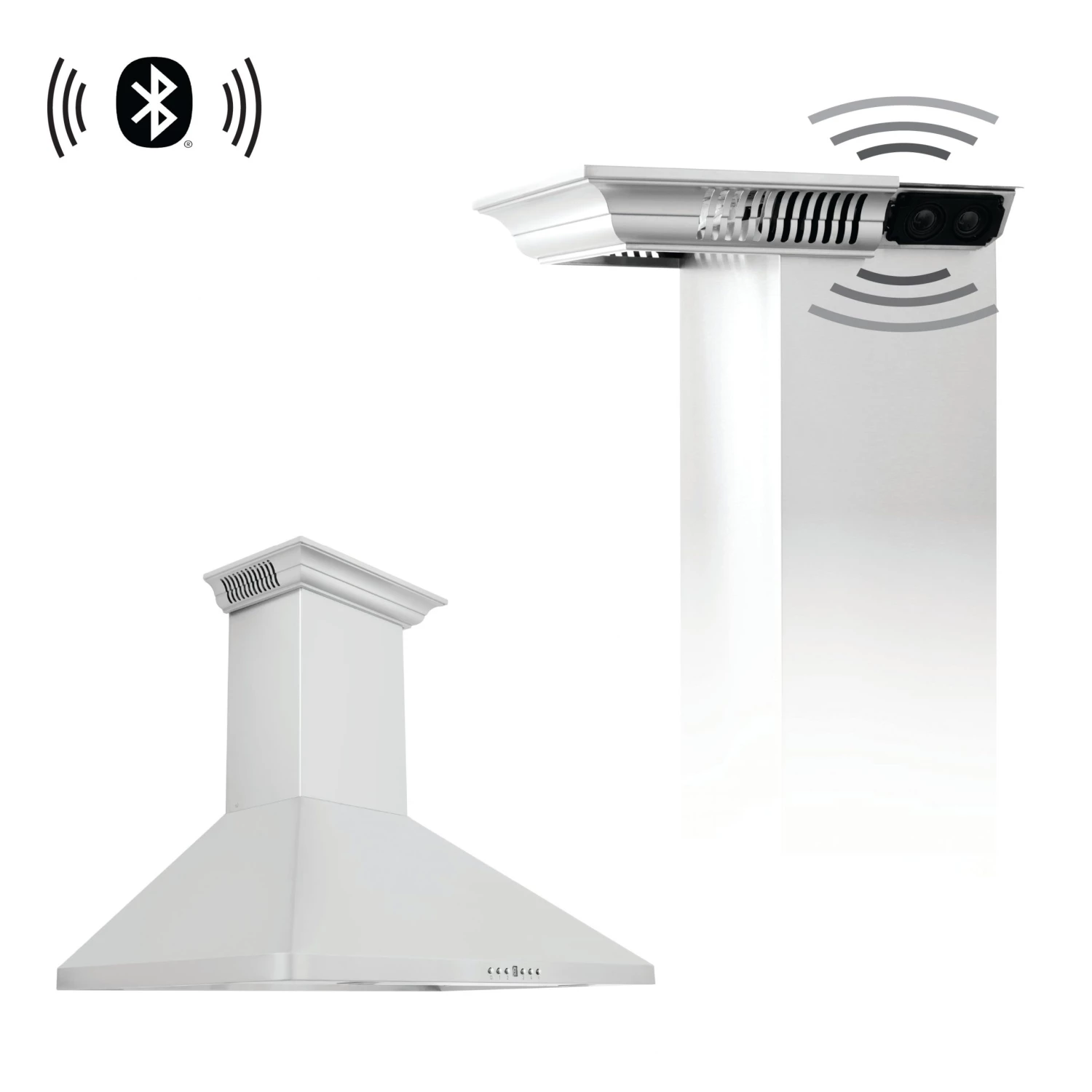 The ZLINE Wall Mount Range Hood with Built-in ZLINE CrownSound Bluetooth Speakers transforms the seamless, elegant ceiling transition of ZLINE Range Hoods into a high-fidelity, wireless sound system, creating the perfect entertainment area for you and your guests. With ZLINE CrownSound , you can pair your smart device up to 50 feet away for optimal access and control of audio in your kitchen. The high-performance 400 CFM, 4-speed motor provides all the power you need to quietly and efficiently ventilate your kitchen while hosting kitchen dance parties or listening to your favorite podcasts. Achieve a functional, modern upgrade that is perfectly harmonized in your favorite ZLINE Range Hood designs.