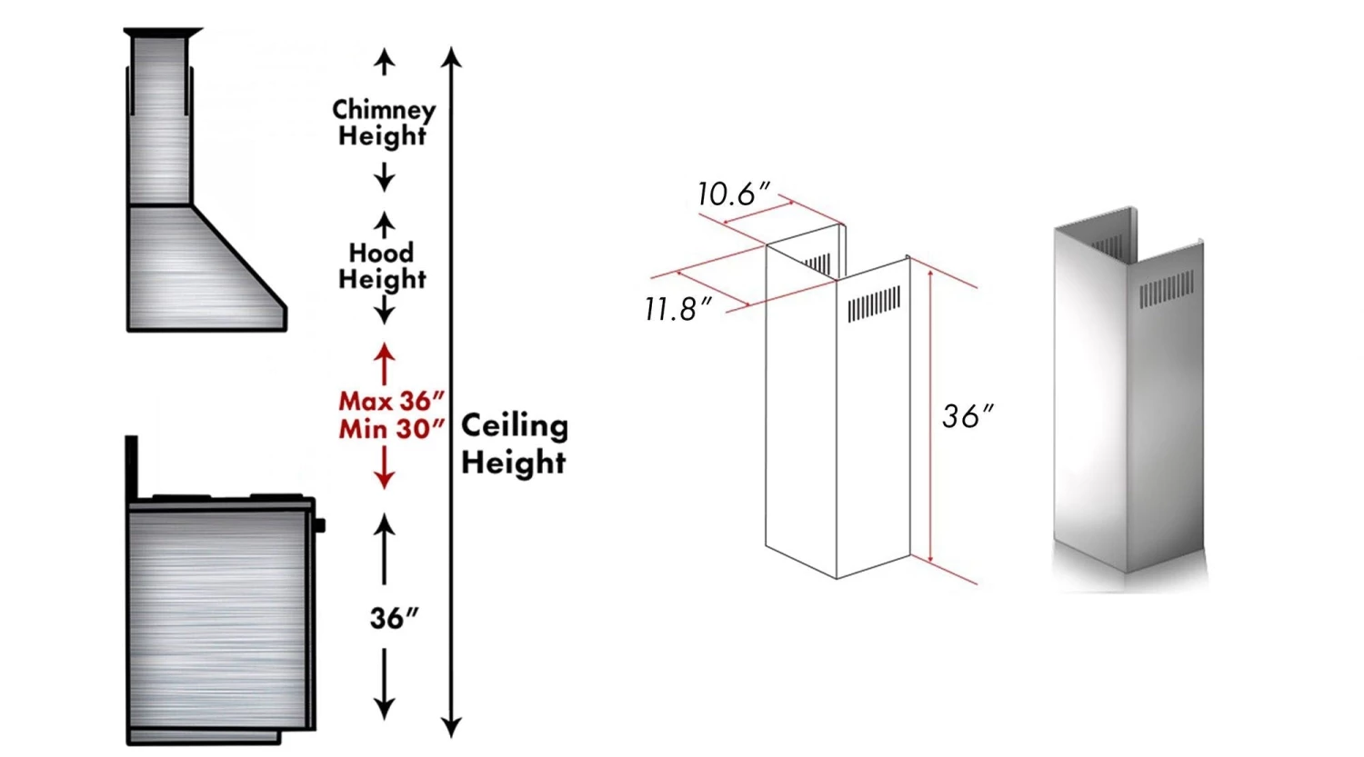 This 36″ tall chimney piece comes with both the 36″ tall chimney extension and an additional standard 16″ tall chimney piece to accommodate ceilings up to 10 ft.
