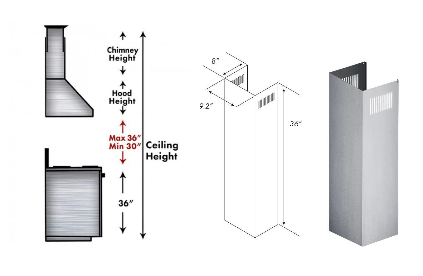 This 36″ tall chimney piece comes with both the 36″ tall chimney extension and an additional standard 16″ tall chimney piece to accommodate ceilings up to 10 ft.
