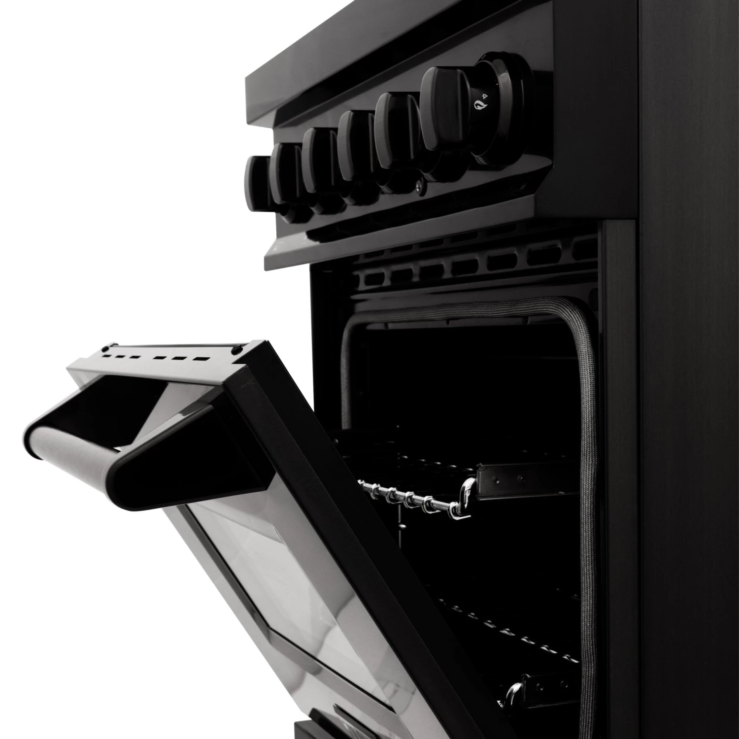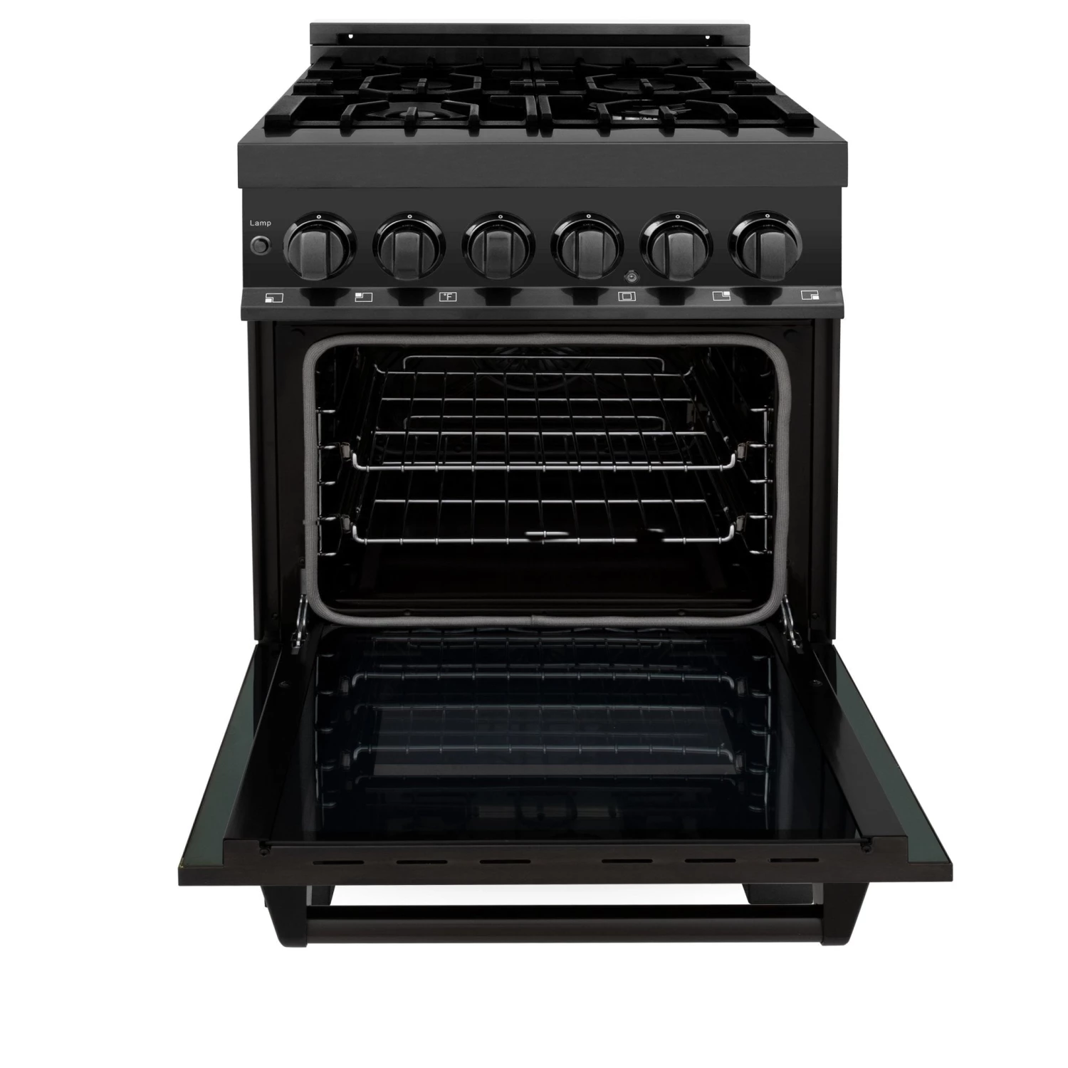 ZLINE’s 24″ Professional Range in black stainless steel is truly unique in the industry. Each piece is hand cut and crafted utilizing premium grade stainless steel which accomplishes its sophisticated “piano black” finish through a technique called PVD (Physical Vapor Deposition) Coating. Also known as sputtering, this technique utilizes a vaporization process to create an atom-bonded, strong ceramic layer in order to achieve its stunning black stainless shine and built-to-last quality. The PVD ceramic layer is composed of abrasion-resistant material, ensuring that its pristine finish will be enjoyed for years to come. The industrial design of the (RAB) is executed through precise lines and detailing done with a precision laser. Each model includes Italian burners delivering over 44,000 BTU’s and also includes a durable, solid-piece Cast Iron Grates finalizing its industrial look.