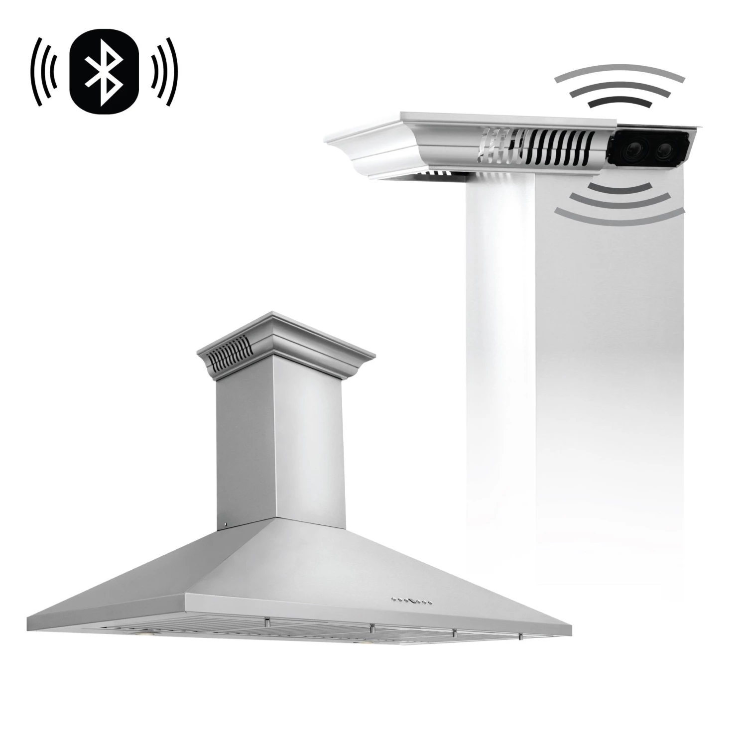 The ZLINE Wall Mount Range Hood with Built-in ZLINE CrownSound Bluetooth Speakers transforms the seamless, elegant ceiling transition of ZLINE Range Hoods into a high-fidelity, wireless sound system, creating the perfect entertainment area for you and your guests. With CrownSound, you can pair your smart device up to 50 feet away for optimal access and control of audio in your kitchen. The high-performance, 4-speed motor provides all the power you need to quietly and efficiently ventilate your kitchen while hosting kitchen dance parties or listening to your favorite podcasts. With its classic 430 grade stainless steel, this range hood contains rust, temperature, and corrosion-resistant properties to ensure a durable vent hood that will last for years to come. Enjoy modern features, including built-in LED lighting for an illuminated culinary experience and dishwasher-safe stainless steel baffle filters for easy clean-up. This wall mount range hood has a ducted vent with easy, simple installation. Achieve a functional, modern upgrade perfectly harmonized with your favorite ZLINE Range Hood designs. ZLINE continues to revolutionize the industry by providing our customers with ZLINE Attainable Luxury. ZLINE proudly stands by the longevity and durability of its range hoods alongside its 3-year manufacturer parts warranty.