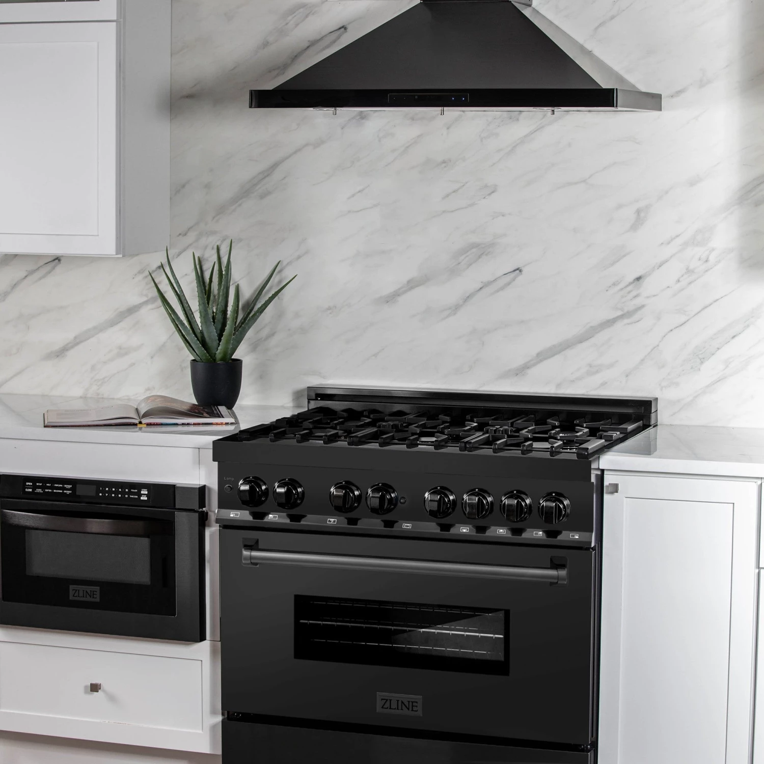 ZLINE’s 36″ professional black stainless steel Range is truly unique in the industry. Each piece is hand cut and crafted utilizing premium grade stainless steel which accomplishes its sophisticated “piano black” finish through a technique called PVD (Physical Vapor Deposition) Coating. Also known as sputtering, this technique utilizes a vaporization process to create an atom-bonded, strong ceramic layer in order to achieve its stunning black stainless shine and built-to-last quality. The PVD ceramic layer is composed of abrasion-resistant material, ensuring that its pristine finish will be enjoyed for years to come. The industrial design of the (RAB) is executed through precise lines and detailing done with a precision laser. Each model includes Italian burners delivering over 65,000 BTU’s and also includes a durable, solid-piece Cast Iron Grates finalizing its industrial look.