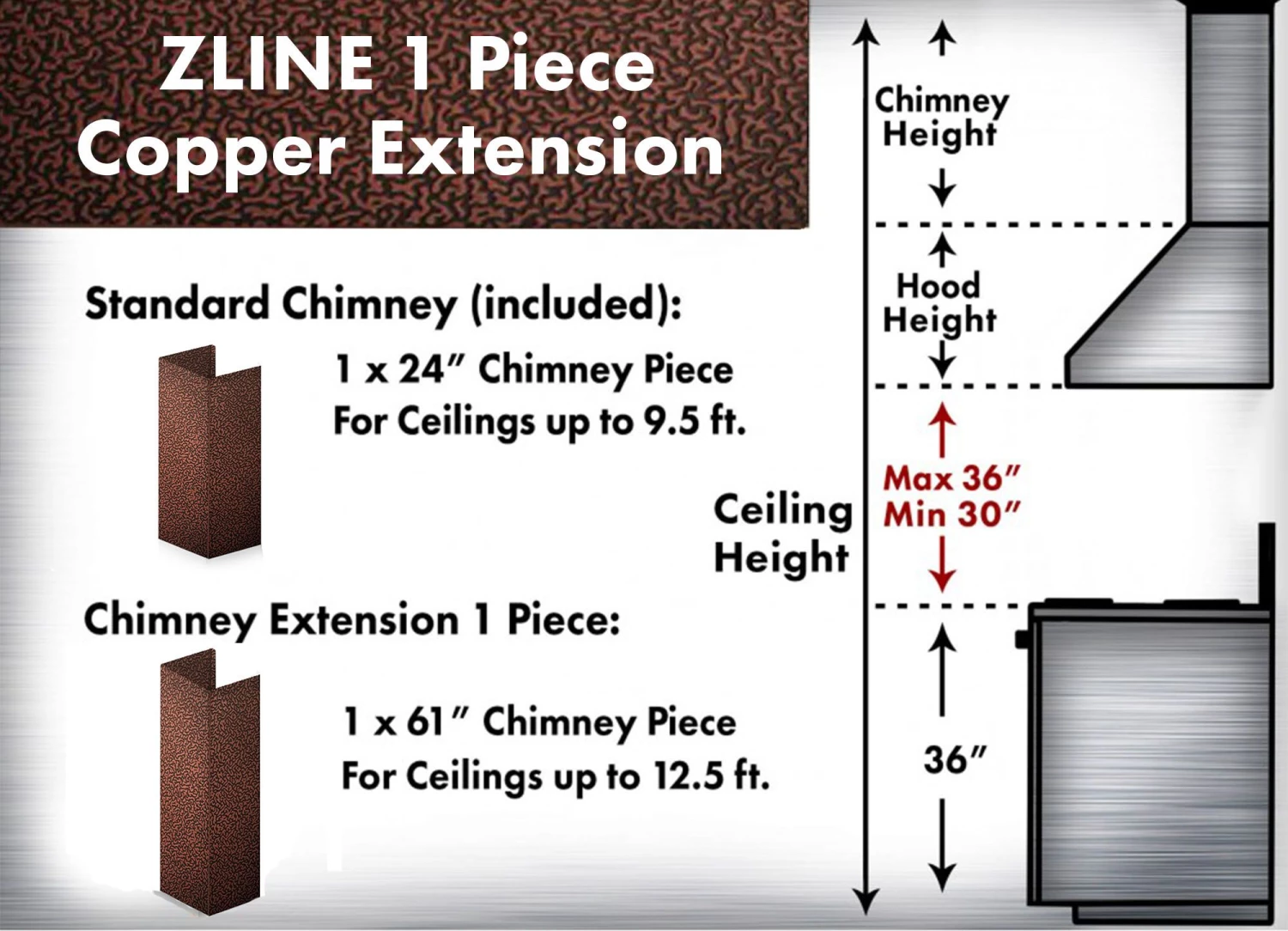 ZLINE 6 ft. Copper Chimney Extension for Ceilings up to 12.5 ft. This 61″ tall chimney piece must be custom cut to the appropriate size. For use with all ZLINE 8KBE range hoods.