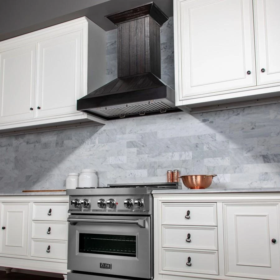 The ZLINE KPDD is a wall mount wooden range hood designed to be both elegant and powerful, featuring the industry’s only lifetime warranty motor. The hand-finished distressed black wood is made from solid pine with a stainless steel inner frame, making it both durable and long-lasting. This durable construction, along with ZLINE’s lifetime warranty on the motor, guarantees a range hood that will last for a lifetime.
